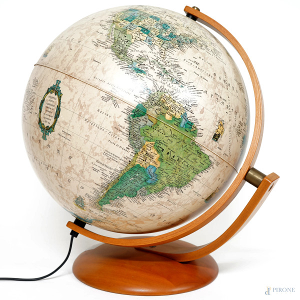 Mappamondo Luminoso Con Base In Legno, Nova Rico, XX Secolo, Altezza CM 44