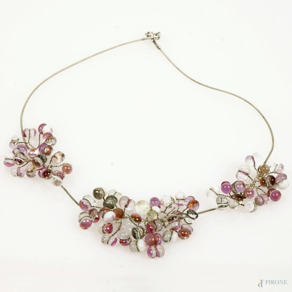 Collana In Argento 925 Con Applicazioni In Vetro Colorato Nei Toni Del Rosa, Lunghezza CM 43