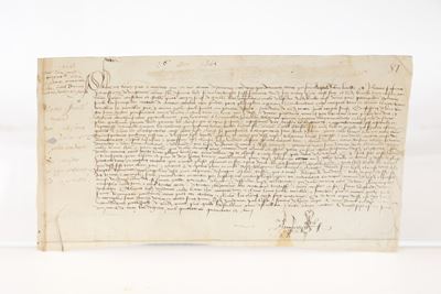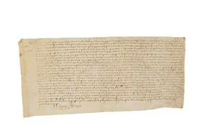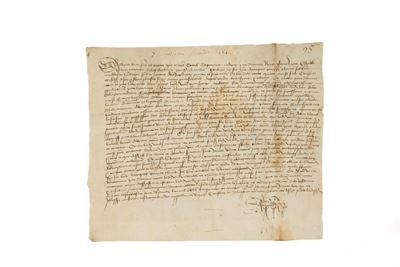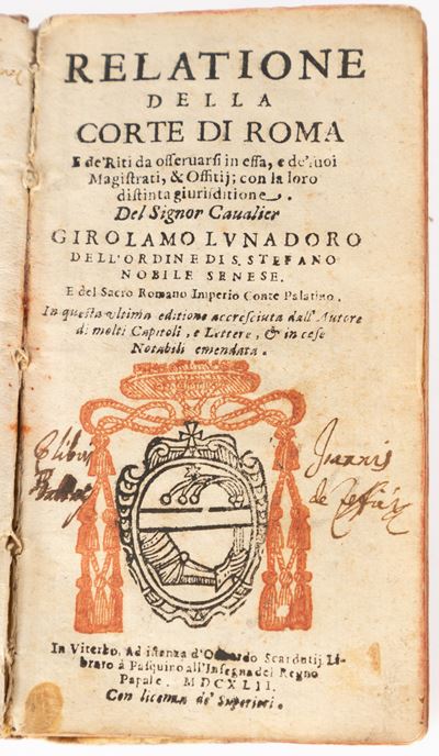 Frammento di pergamena del secollo XV°/XVI°, con sigillo cardinalizio in cera contenuto in capsul...