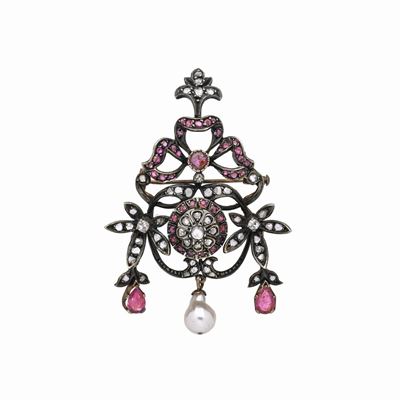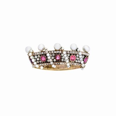 Spilla Corona in Oro Rosa 18k, Diamanti, Rubini e Perle