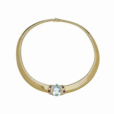 Girocollo in Oro Giallo 18k, Acquamarina, Diamanti e Zaffiri