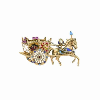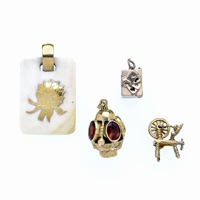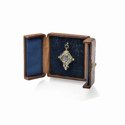 Pendente Reliquiario in Oro Giallo 22 Kt, Cristallo DI Rocca e Smalti Policromi