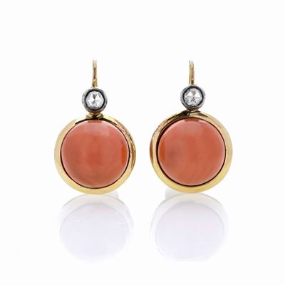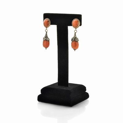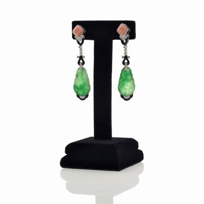 Paio DI Orecchini Pendenti in Oro Bianco 18k, Corallo Rosa, Diamanti, Onice e Giadeite