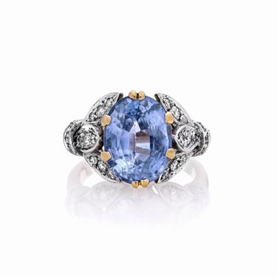 Anello in Oro Bianco e Oro Giallo 18k, Diamanti e Zaffiro Ceylon