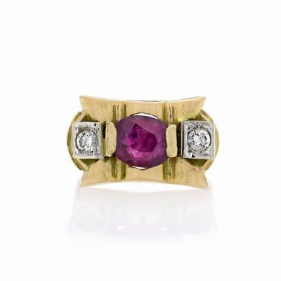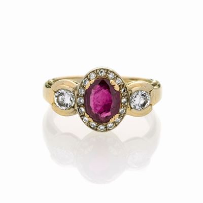 Anello a Ponte in Oro Giallo 18k, Diamanti e Rubino