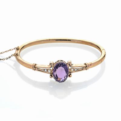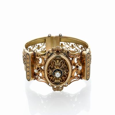 Alto Bracciale Rigido Porta-ricordi in Oro Giallo 18k, Smalto e Perle