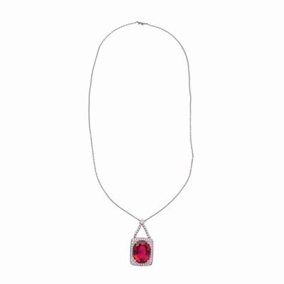 Pendente con Catena in Oro Bianco 18k, Diamanti e Grande Tormalina Rosa