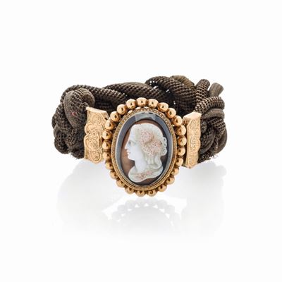 Bracciale Vittoriano Commemorativo in Oro Giallo 18 Kt, Cammeo in Agata Incisa e Capelli