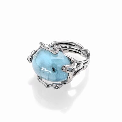 Grande Anello in Oro Bianco 18 Kt, Diamanti e Acquamarina