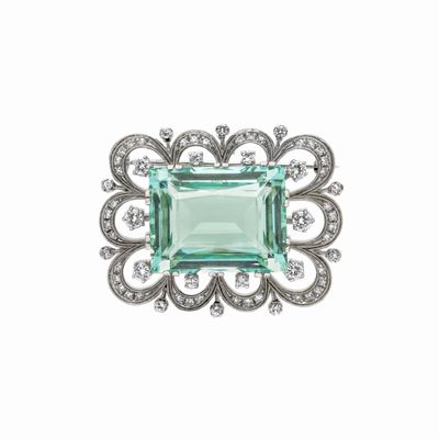 Spilla Rettangolare in Oro Bianco 18k, Diamanti e Grande Acquamarina