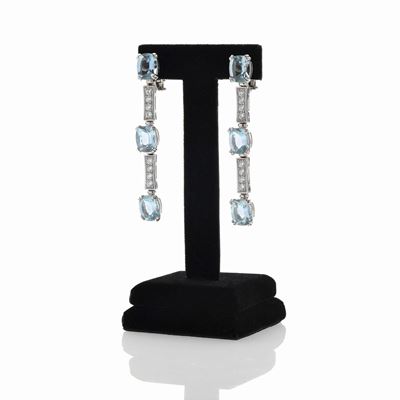 Paio DI Lunghi Orecchini Pendenti in Oro Bianco 18k, Diamanti e Acquemarine