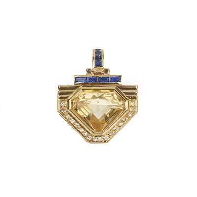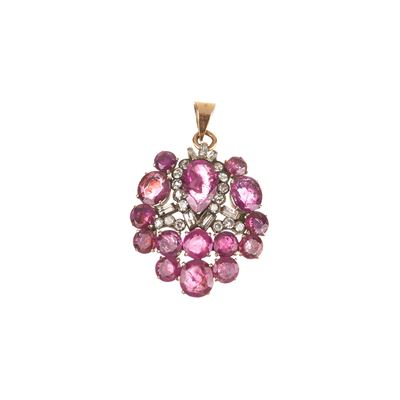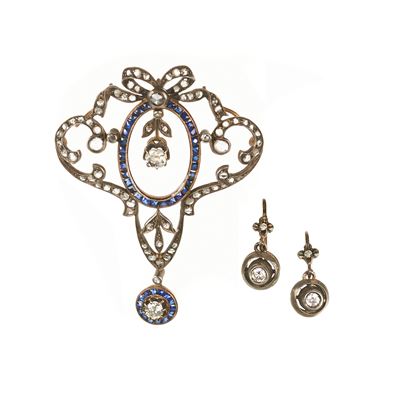 Pendente e paio di orecchini in oro a basso titolo, argento, diamanti e zaffiri