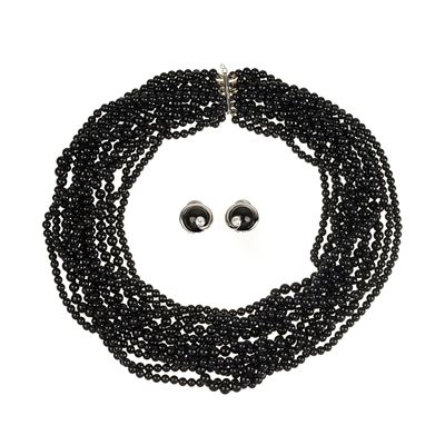 Collana in oro bianco e onice e paio di orecchini in oro bianco 18 kt, diamanti e onice