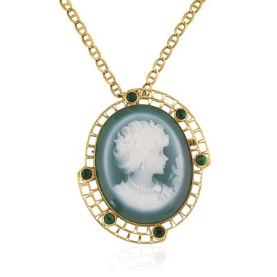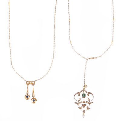 Collana in oro a 9 kt e microperle e pietra verde ed un'altra collana con zaffiri