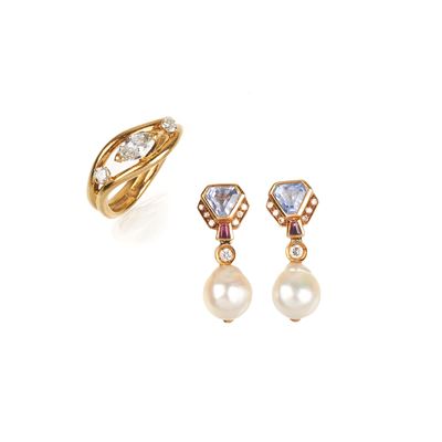 Paio di orecchini pendenti e anello in oro giallo 18 kt, diamanti, rubini e acquamarina