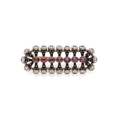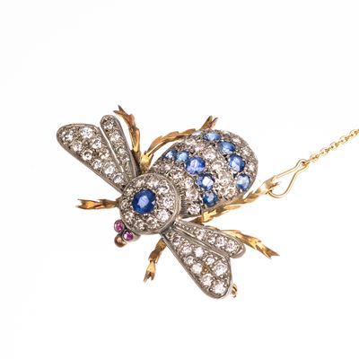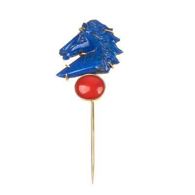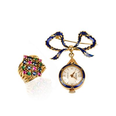Spilla in oro giallo 18 kt, smalto blu e anello in oro giallo 18kt, rubini, zaffiri e smeraldi