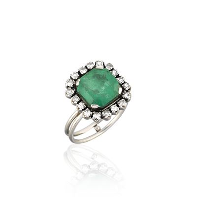 Anello a margherita in oro bianco 18 kt, diamanti e smeraldo