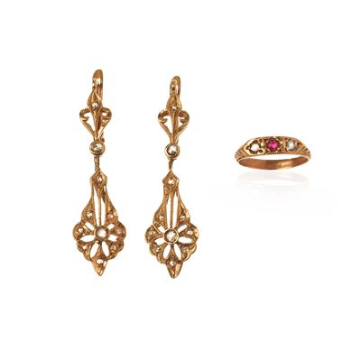 Paio di orecchini pendenti in oro giallo 18 kt, diamanti e anello da bambina in oro giallo 18 kt