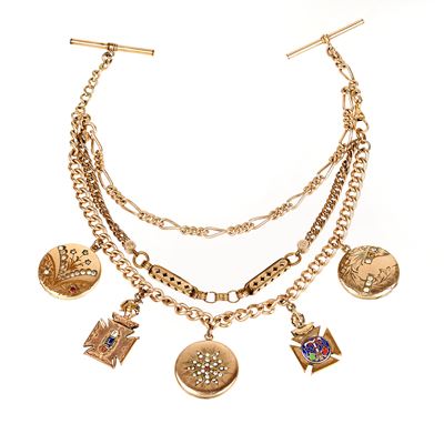 Collana a maglie intrecciate con charms in oro a 9 kt, metallo doarato, smalti policromi e pietre