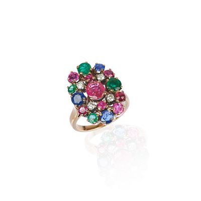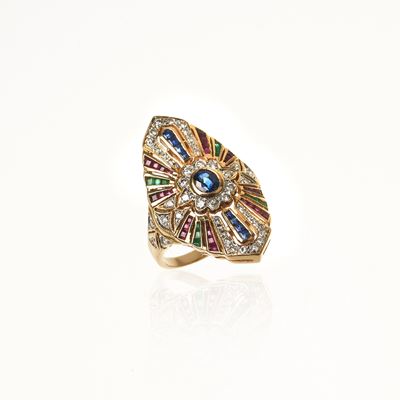 Anello a scudo in oro giallo 18 kt, zaffiri, rubini, smeraldi e diamanti