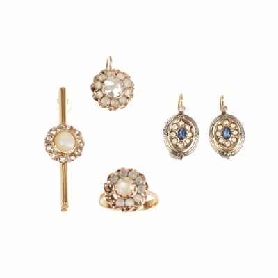 Orecchini, anello e spilla in oro giallo 18 kt, oro a basso titolo, pietre e madreperla