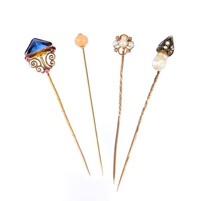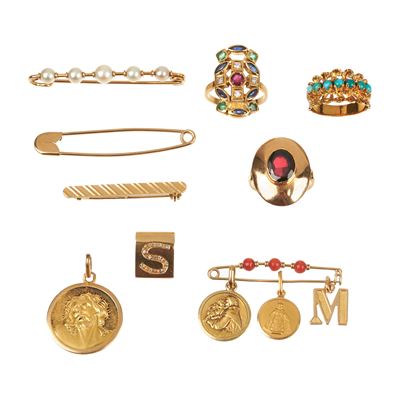 Tre anelli, quattro spille, una medaglia in oro 18 kt e pietre
