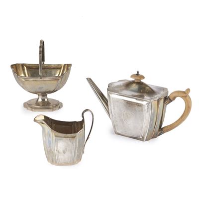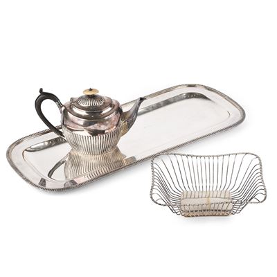 Teiera inglese in sheffield, vassoio in metallo argentato, cestino portapane in argento 800