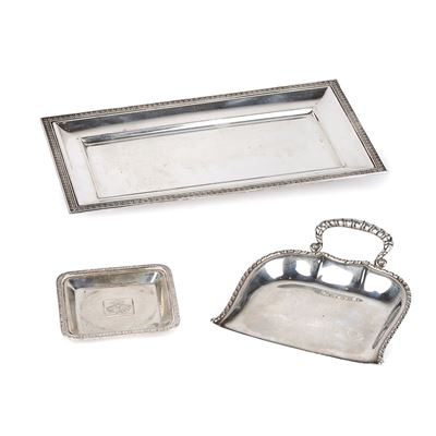 Centrotavola rettangolare, posacenere quadrato in stile impero e paletta in argento 800