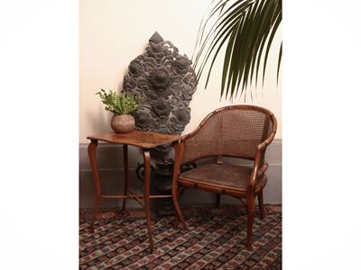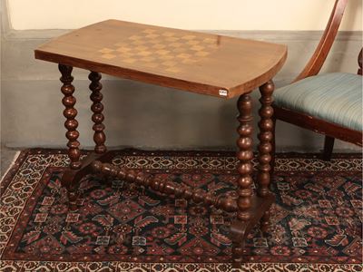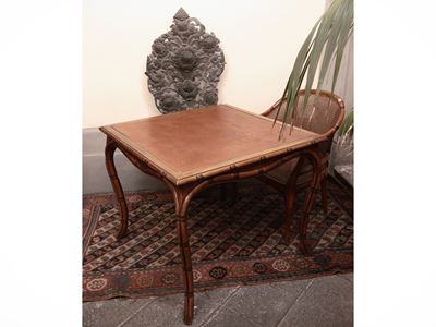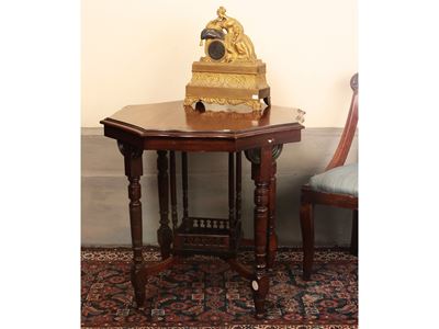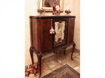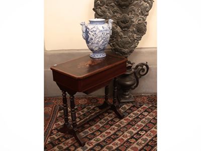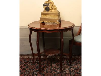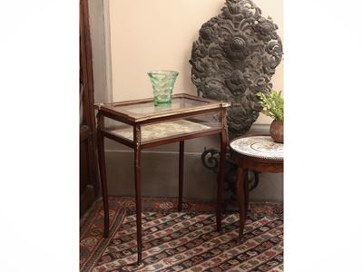 Tavolino teca per collezioni impiallacciato in mogano ed altre essenze