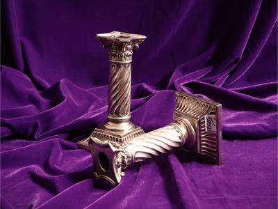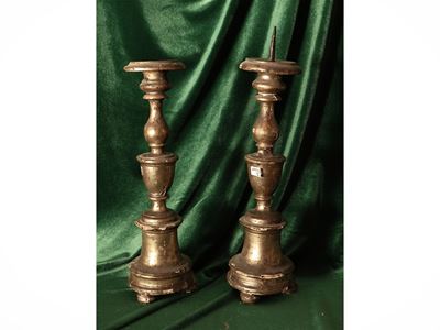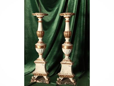 Coppia di torciere in legno intagliato, dorato e laccato azzurro