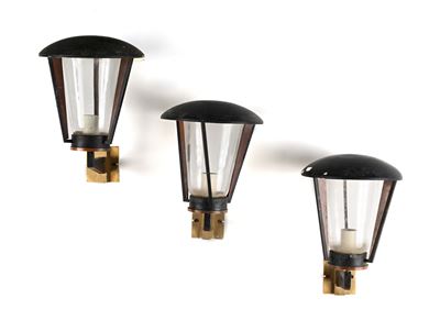 3 lampade da soffitto in ottone e diffusori in vetro acidato e satinato
