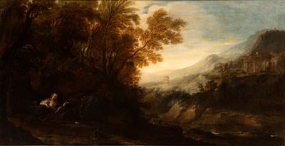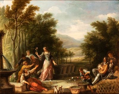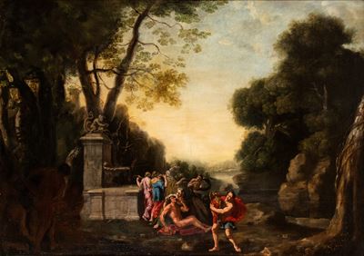 Paesaggio con fontana, corso d'acqua e scena di baccanale