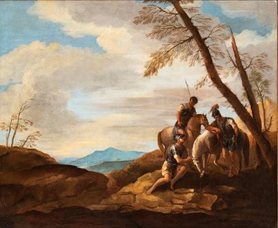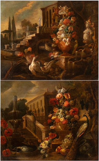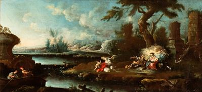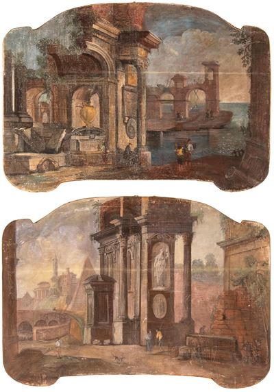 a) Capriccio costiero con figure; b) Capriccio architettonico con figure. Coppia di dipinti