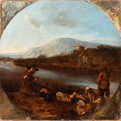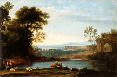 Paesaggio con pastori e greggi al pascolo, specchio d'acqua e Colosseo sullo sfondo