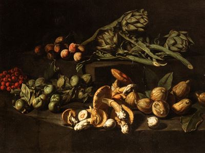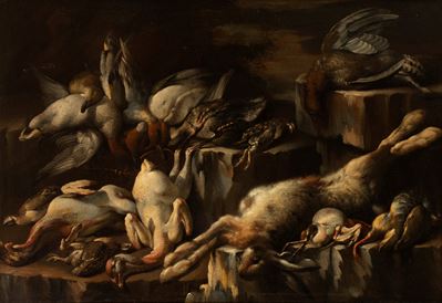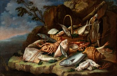 a) Natura morta con pesci e crostacei; b) Natura morta di pesci e conchiglie. Coppia di dipinti