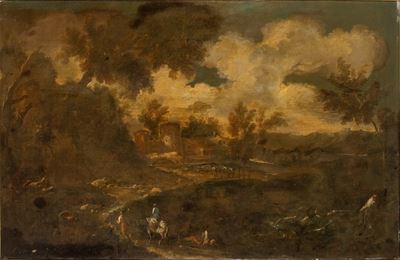 Paesaggio con corso d'acqua, ponte, monaco e viandanti