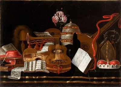 Vanitas con spartiti, libri, tiara, corona, cappello cardinalizio e strumenti musicali