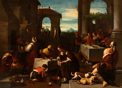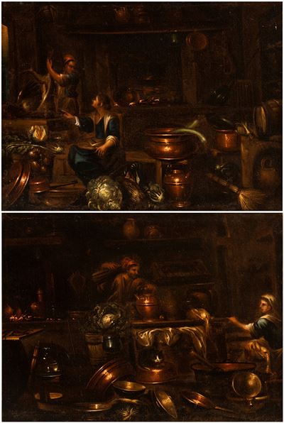 a) Cucina con due cuoche, ortaggi e pentole in rame; b) Cucina con coppia di figure, gatto e pent...