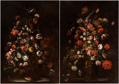 Coppia di grandi nature morte con bouquet di fiori in vasi di metallo istoriati