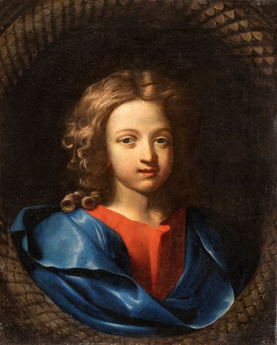 Ghirlanda di fiori con Sacra Famiglia e San Giovannino