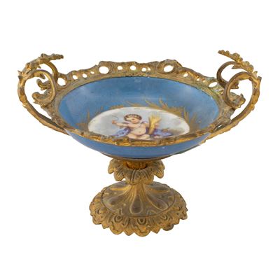 Piccola Alzata In Porcellana Policroma Con Montatura In Bronzo Dorato