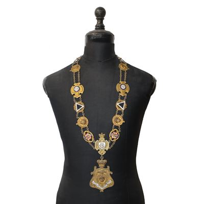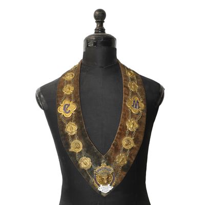 Collare della massoneria, in metallo dorato su stoffa di velluto. W.J.Barrett Lodge