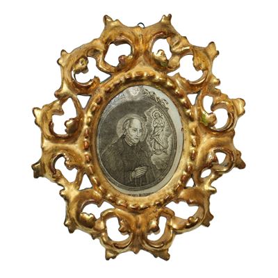 Figura di donna in miniatura con cornice a cartoccio in legno dorato
