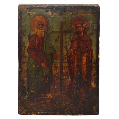 Icona bizantina con Cirillo e Costantino in legno di abete dipinta a tempera e olio