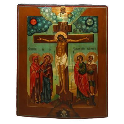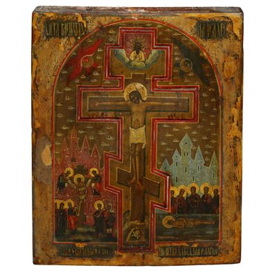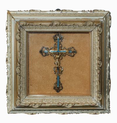 Crocifisso in metallo argentato e dorato con smalti, in teca.