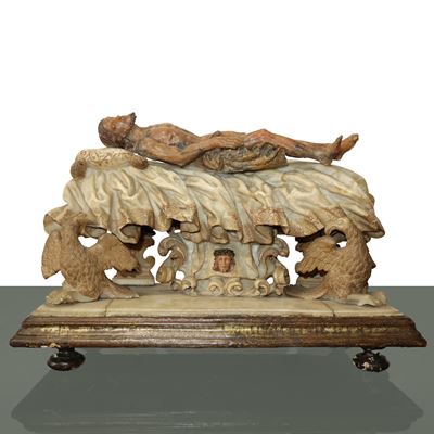Scultura della deposizione di Cristo su base con aquile in alabastro e in alabastro rosa di Trapa...