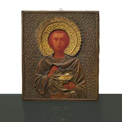 Icona russa con riza in rame cesellato e sbalzato raffigurante San Pantaleone