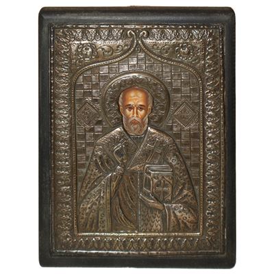Icona bizantina con riza ricoperta in argento 750 raffigurante San Nicola