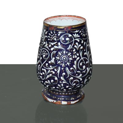 Piccolo vaso a motivi rinascimentali con smalti di sottili fili d'oro su base blu e smalti florea...