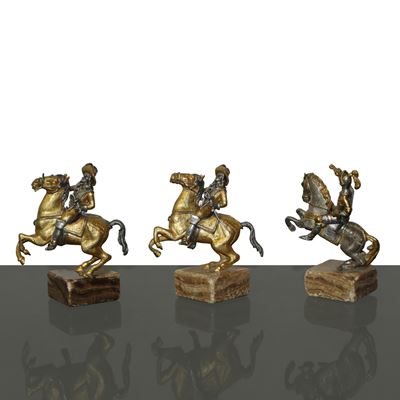 N°3 piccole statue di cavaliere a cavallo in bronzo argentato e dorato montate su base in onice